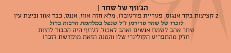 המנה האהובה על שחר פרידמן ז"ל, שהגיעה לדירוג הגבוה ביותר במדדים האישיים שלו, הפכה למנה מיוחדת לזכרו. עם כל הזמנה מקבלים סטיקר ואת הצוואה של שחר, כדי לשתף את מסר האהבה והנתינה שהוא השאיר אחריו.